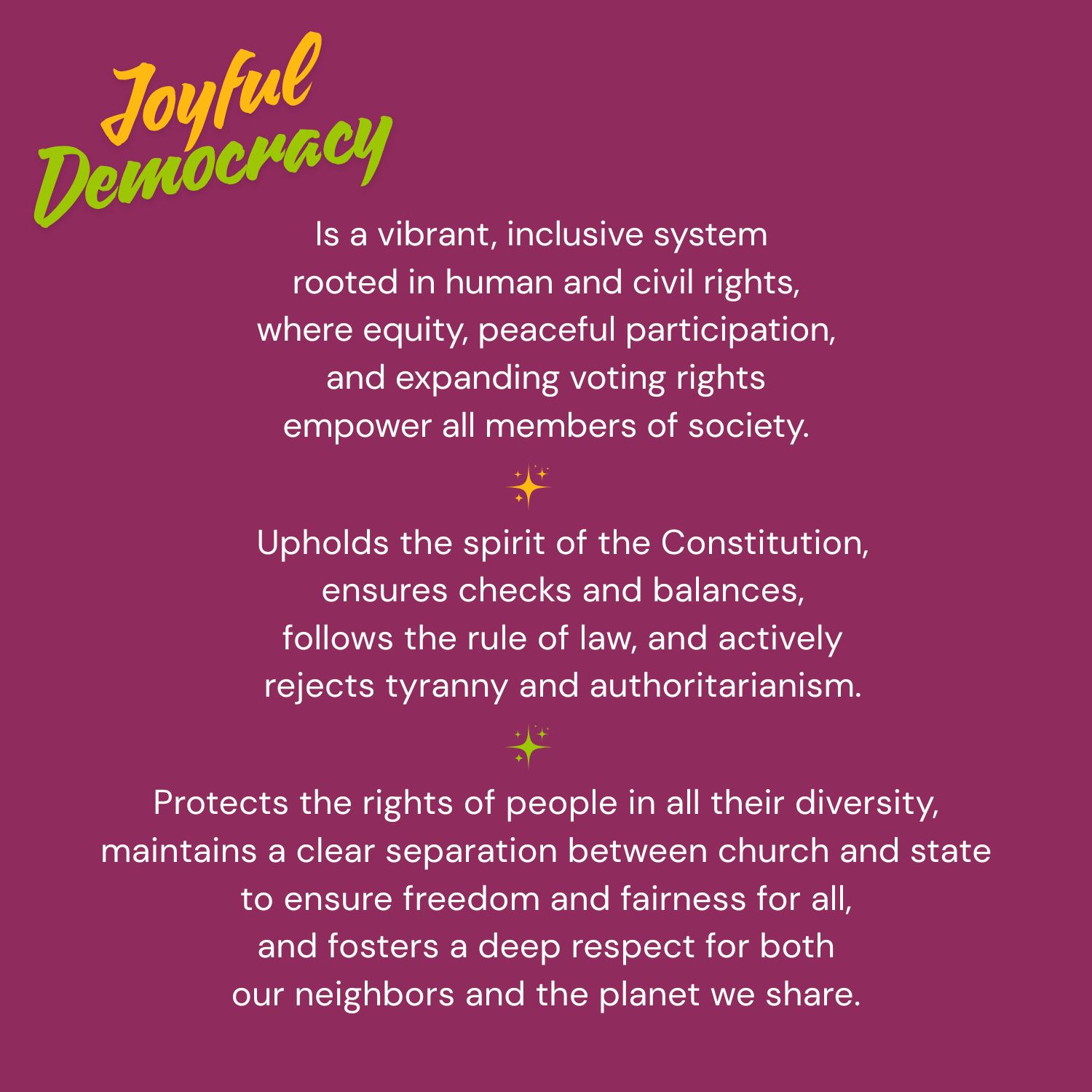 Joyful democracy is democracy where you are empowered, engaged, and energized— not just enduring the fight, but thriving in it.